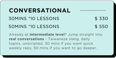 All lessons are priced in USD, unless you are paying via Taiwan bank transfer — in that case, the amount will be converted to TWD based on the exchange rate on the day of your trial lesson.