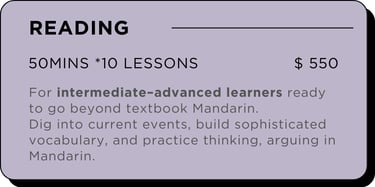 Get a feel for my teaching style while I assess your Mandarin level. We will also chat about your learning goals so I can recommend the best lesson type for you.
